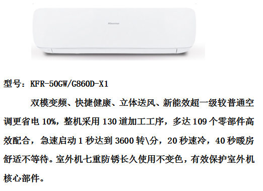 当前位置:首页 > 强制节能产品-电器-壁挂式空调 > 海信(HISENSE)KFR-50GW/G860D-X1 壁挂空调 2匹挂机
